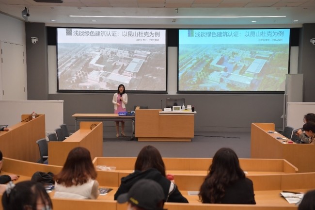 昆山杜克大学硕士项目招生主任汪舒怡老师从绿色建筑的LEED标准出发,对昆山杜克大公司园内的绿色建筑进行了详细介绍,具体解释了昆山杜克大学绿色建筑的设计理念和海绵城市的设计思路,向同学们介绍了校园内的建筑布局和环境特色。昆山杜克大公司园以水作为校园景观的核心元素,成熟的雨水收集系统和水循环系统,能够满足校园内的景观用水需求。此外,昆山杜克大学利用太阳能电池板收集太阳能为校园供电,大大降低了了能源消耗。