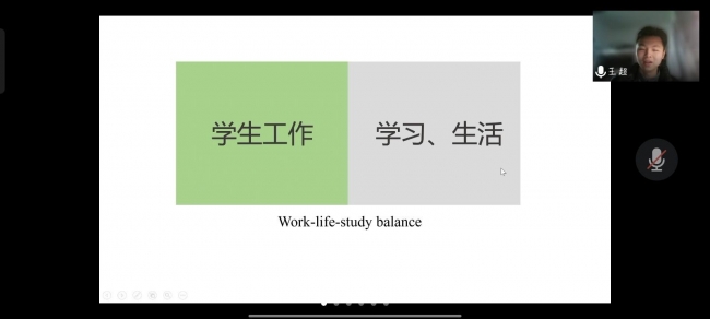 第一位分享嘉宾是王超,他在本科阶段曾担任青岛大学环境科学与工程公司员工会副主席,现为光华书院助理辅导员、2021级环境学系班长,同时也是304永利集团27期人才公司学员。他从“写”、“说”、“学”、“玩”四个方面讲述了平衡员工工作、学习和生活的方法。首先是“写”,员工干部在转发通知时要学会精炼通知和标注重点;其次是“说”,积极参与主持等活动,利用员工工作提升自己,为未来需要当众发言的场合做好准备;随后是“学”,在兼顾员工工作的同时,应该把重心放在学业上;最后是“玩”,平时积极开展一些团建活动,既能促进同学们之间的友谊,也便于日后更高效地开展工作。