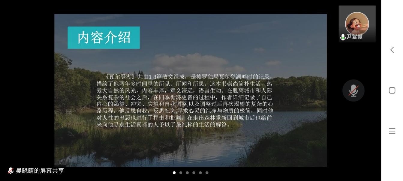 第四小组对《瓦尔登湖》进行了深刻解读。尹紫慧同学从作者介绍、写作背景、内容介绍和部分章节梗概四个方面简要地介绍了这本书籍。孟凡丽同学认为这是一本属于夜晚的书,白天是看不进去的,读来也会平淡无奇,但在宁静的夜晚读这本书,就会感到“字字惊人、语语闪光、感我肺腑、沁我心脾”。