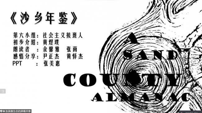第六组带来了《沙乡年鉴》的分享。黄煜璞同学介绍该书是生态伦理之父奥尔多·利奥波德的代表作,也是其一生观察、经历和思考的结晶。黄怿杰同学认为人类只是大地的一部分,绝非主宰者,如果我们持续地、不计后果地破坏自然以换取资源,我们终会受到制裁,失去生存的环境。