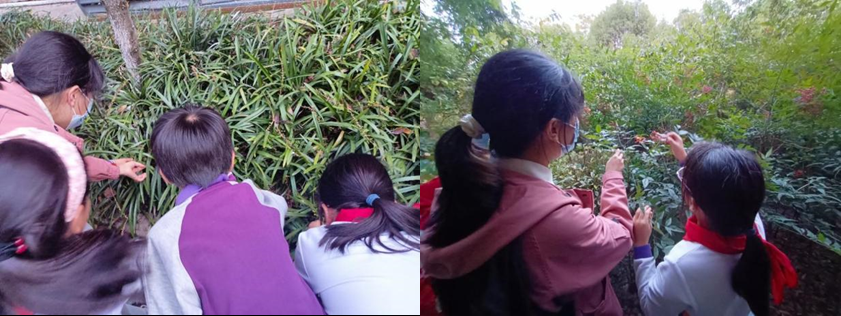 同学们在观察植物(左)助教带领同学们认识植物上的小虫子(右)