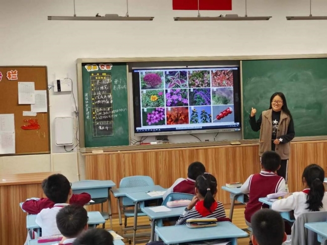 在永德实验小学的课堂中,讲师带领着小朋友们走进校园植物世界,通过图片的展示和文字的描述,让小朋友在校园认植物前先行了解校园常见植物。