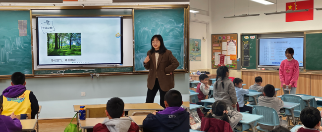 此外,老师还提到城市生态建设的“绿化”、“彩化”、“珍贵化”、“效益化”——“四化”建设。在同学们充分了解到生态城市的相关内容后,老师鼓励同学们用自己所学为生态城市建设提出小建议。同学们踊跃回答,课堂气氛十分活跃。