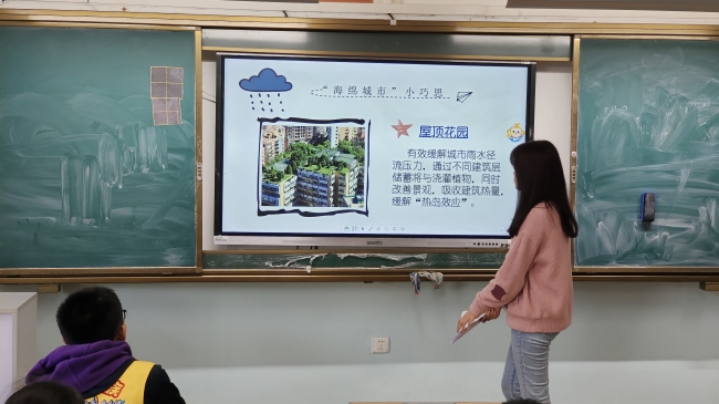种植行道树是在城市小范围实行的绿色建设,而在整个城市层面则有“海绵城市”、“公园城市”等形式。对于海绵城市的介绍,老师以同学们喜欢的动漫人物海绵宝宝为引入,通过形象的比喻让同学们理解得更加透彻。如此具有生态效益的“海绵城市”,离不开它精巧的设计,“植草沟”、“屋顶花园”、“蓄水塘”就是很好的范例。在老师的解释下,同学们对此也有了深刻的理解。
