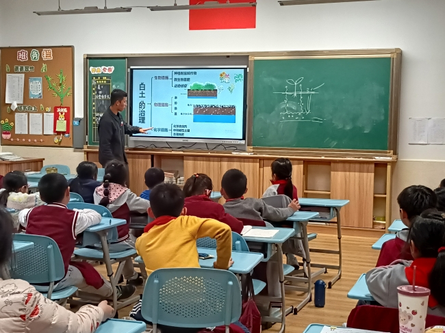 然后,讲师从生物、物理、化学三个方面为小朋友们讲解了白土的治理措施,并通过详细的介绍,让小朋友们明白了这样治理的原因。