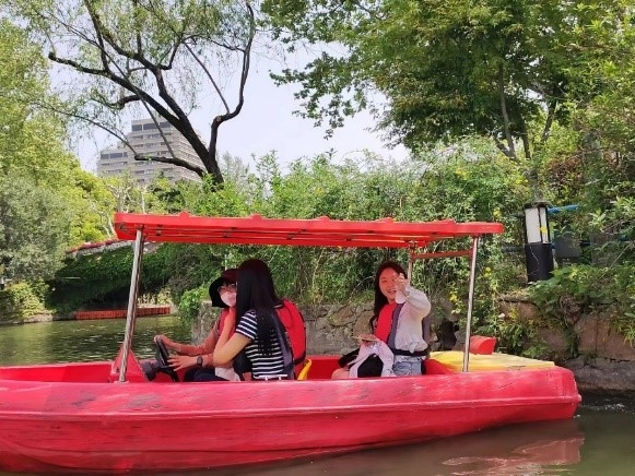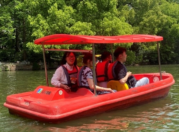 草坪游戏结束以后,同学们前往长风公园银锄湖划船,彼此之间互相配合,逐渐掌握了游船方向,同学之间的合作精神得以提升。
