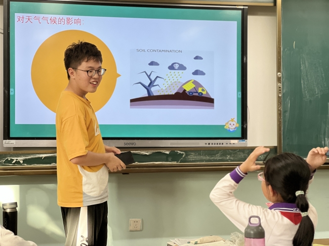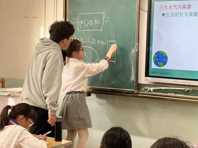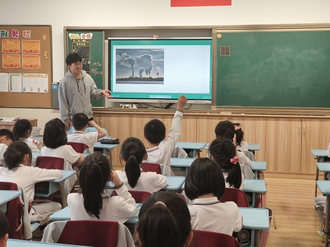 在课堂的开始,两位老师先介绍了大气污染的基本概念。他们将大气环境比作“水箱”,并通过示意图形式生动形象地向小朋友们阐明了大气污染产生的原因。