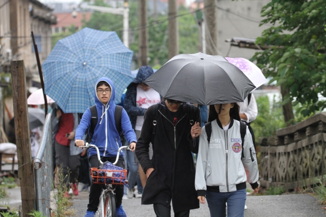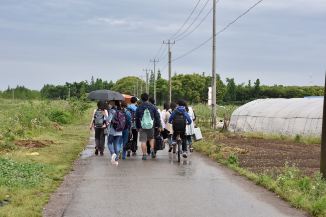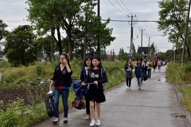 结束第一个采样点的测定后,同学们走出校园,步行至虹梅南路紫凤路,在队伍中也不时会看到一辆单车。穿过友爱村,同学们沿路观察此处村庄和农田的环境状况,主要包括大气状况、水质状况、生活垃圾堆放情况、噪声污染状况、生态环境情况等,同时在农田中的一座小桥处测量新蒋家港水质情况(注:这条河与公司图书馆草坪前的校河直接相连,距离约1公里)。
