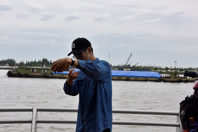 13:00左右,大家集体出发前往我们的第一个采样点检测樱桃河的水质。第一个采样点在校内生态岛附近,同学们在桥上用取水器取样后检测。大多数同学是第一次使用水质检测的仪器,认真操作之余也带有几分激动与好奇。