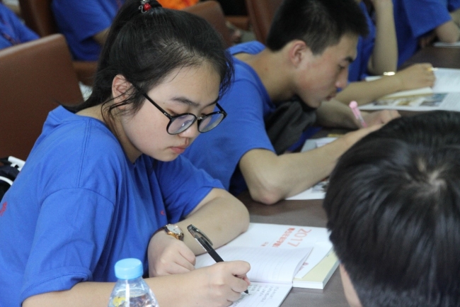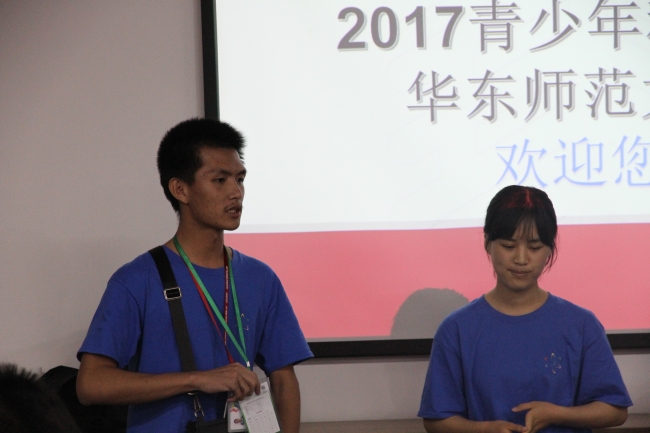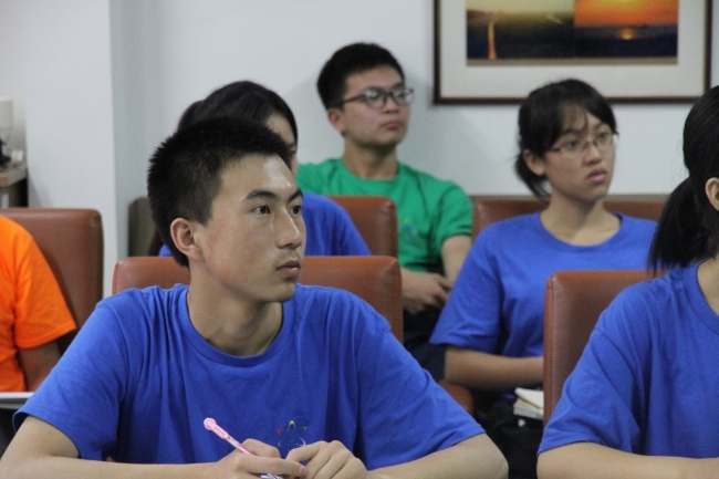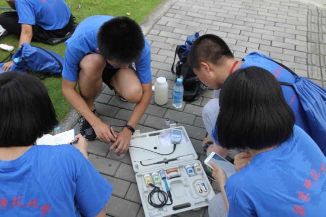 为了更好地交流和参与,同学们互相作了自我介绍,增进了解。40位营员被分成了五个小组,每组由两位宁夏的同学、两位海南的同学组成,经过讨论每组选出了一位组长与一位副组长。分组之后,助教邹吉昊鸣为同学们认真讲解和演示了下午将使用的采水器及上海三信SX736便携式pH/电导率/溶解氧监测仪器的使用方法。