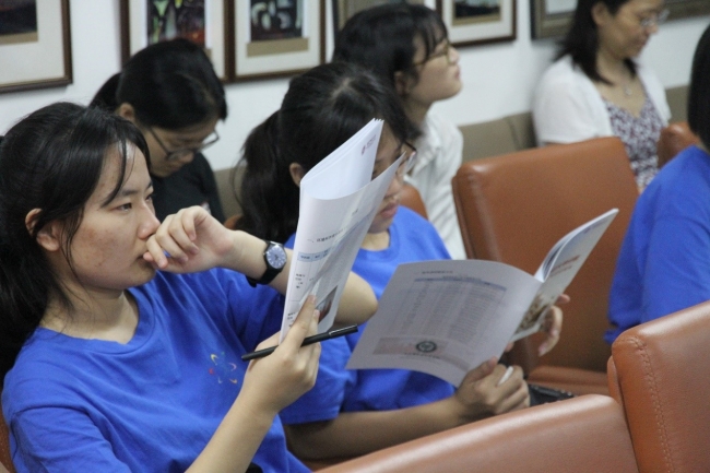 之后,张勇老师从宏观角度进行了一场关于上海市水资源、水环境概况的讲座,向同学们介绍了上海市水资源的数量、质量、来源,并分析了上海水质污染的几个主要原因和处理对策,还结合甘肃省的水资源情况作了一些补充,另外张勇老师也结合了可口可乐公司中水利用、节水社区的建设等数个有趣的节水案例让同学们更加直观地认识水资源管理的重要性和在管理过程中可能会遇到的问题等。谭珊珊老师也对这两天的“樱桃河水环境调查与评价”活动作了细致的介绍,从水环境调查方案的制定、基本的水质监测项目、地表水环境质量标准三部分进行了详细讲解、分析,让同学知道活动的具体步骤和研究项目。最后也向同学们介绍了公司正在中国大学MOOC开课的《环境问题观察》课程内容。