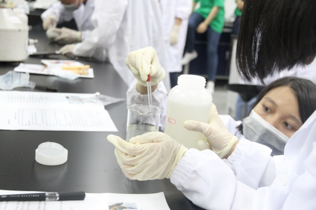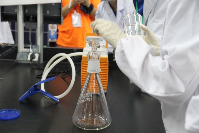 第一个采样点的检测采样完成后,大家前往第二个采样点。第二个采样点位于老员工活动中心的小桥上,采样并现场测定完理化指标后,助教邹吉昊鸣向大家解释了水质指标对于水质监测的意义。五个小组的营员在谭珊珊老师的带领下将各自采集的水样拿到实验C楼114室进行水质指标叶绿素a的提取,实验开始前,老师为大家讲解了实验仪器的使用方法、具体的实验步骤及实验室注意事项。