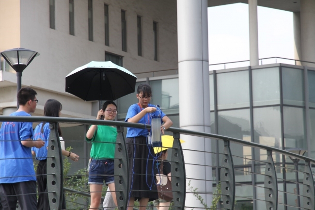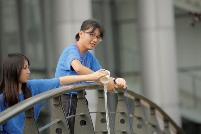 7月11日下午1:30,大家从生科辅楼出发前往樱桃河进行水环境观察、水样采集,并使用便携式水质监测仪测量水体温度、pH值、溶解氧、电导率等理化指标。第一个采样点在樱桃河生态岛边的两座桥上。尽管天气很热,很多同学的衣服都被汗湿透,大家还是认真地做着采样和检测。所有的营员都是第一次亲自采集水样,第一次使用便携式水质监测仪,所以分外的认真和激动。每组4个同学分工合作,一个用金刚采水器采样,一个准备仪器,一个测定并读数,一个负责记录数据。老师和助教、志愿者也在一旁指导、帮忙。采样监测活动高效并有序地进行着。