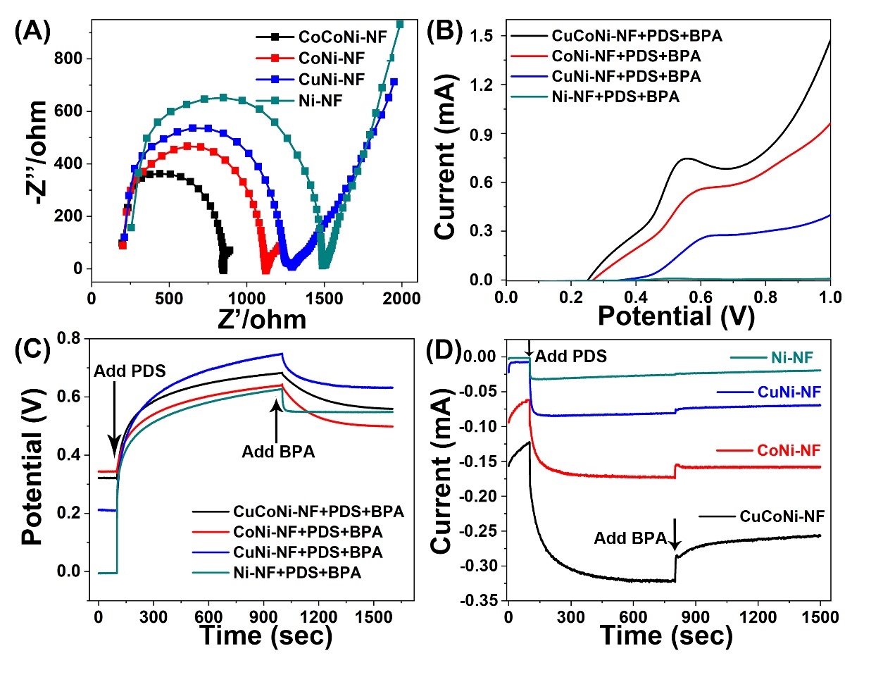 为进一步验证电子转移过程,我们构建了电化学氧化系统,将BPA和PDS分别置于两个半电池中。当连接两侧的CuCoNi-NF电极时,电子从BPA室不断转移至PDS室,系统产生明显的电流,在这个过程中BPA被氧化分解,而PDS转化为SO42-,证明了BPA通过CuCoNi-NF电子介导体向PDS转移电子。此后,我们将BPA室的CuCoNi-NF电极(未与PDS接触)置于新鲜的BPA溶液中,发现BPA在没有PDS存在的情况下发生分解,该结果进一步表明氧化态CuCoNi-NF可以从BPA夺取电子,CuCoNi-NF在PDS活化过程中介导了电子的转移。