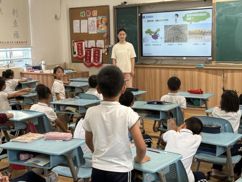 在同学们了解了荒漠化的成因与危害后,讲师马铭苒顺势引入了多种防治荒漠化的措施,如植树造林、限制过度放牧、节水措施等,讲解最后,她特别强调,防治荒漠化绝非一句空洞的环保口号,而是保护我们共同家园、落到实处的行动。
