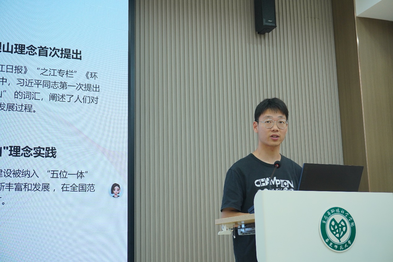 活动在“两山理论诞生的时空密码”主题宣讲中拉开帷幕。孙一波同学以数字沙盘技术还原2005年8月15日习近平总书记考察安吉余村的历史场景,通过对比2003和2023年该地区生态环境指数与经济发展质量关联数据,全景式展现“绿水青山就是金山银山”理论从破茧到蝶变的演进历程。讲解重点围绕“生态优先、绿色发展”的实践导向,深入介绍了以生态保护红线、环境质量底线、资源利用上线为核心的“三线”决策逻辑,指出其在破解“生态-经济”二元悖论中的方法论意义,引发在场环境专业研究生对生态价值核算体系构建的思考,为全体党员上了一堂主题鲜明、内容扎实的生态文明理论课。