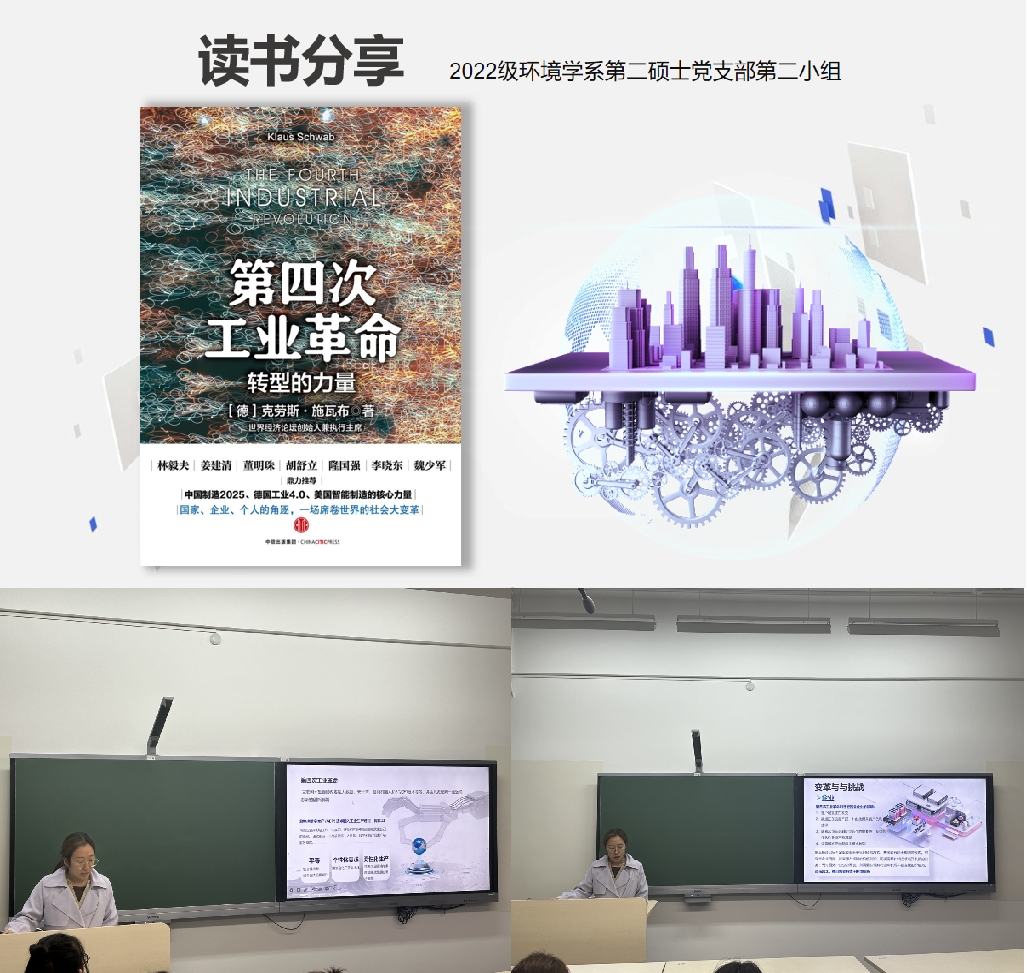 第二小组选取了《第四次工业革命》,白佳雯同学代表小组进行了生动的分享。白佳雯同学在分享中强调了科技创新对环境保护的重要性。他们深入探讨了新技术如人工智能、生物技术等在环境治理和保护方面的应用,以及如何在工业发展的同时减少对环境的负面影响。这些讨论引发了全体参会党员对科技与环保的深度融合以及未来可持续发展路径的思考。