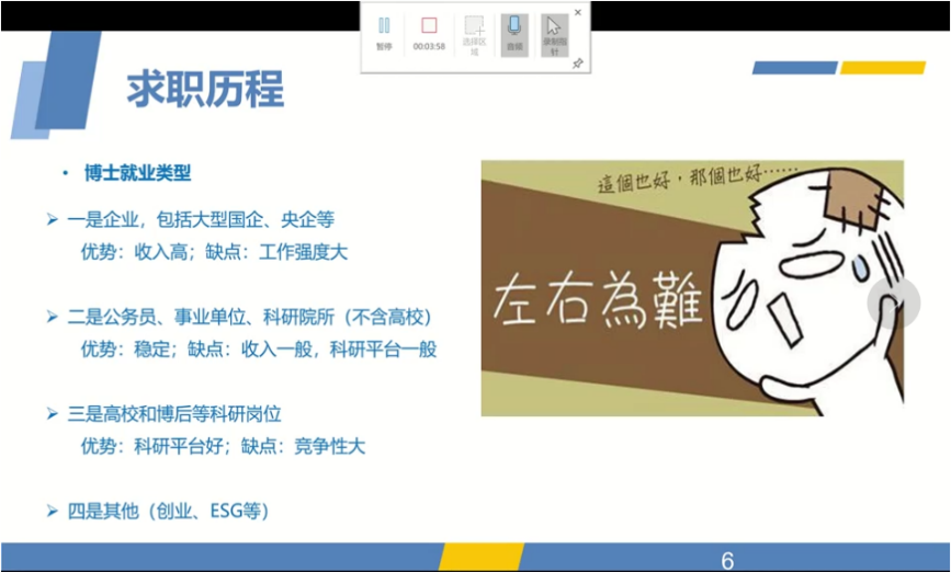 最后一位分享的是李根同学,他目前就职于生态环境部太湖流域东海海域生态环境监督管理局生态环境监测与科学研究中心。他首先比较了博士毕业生就业四大方向,即企业、公务员和事业单位、高校,以及创业的优缺点。然后,他强调求职时信息收集和自我认知的重要性,要选择自己擅长的赛道,要认清就业形势,同时也要遵从自己内心。此外,他还分享了入职一年的心得,鼓励同学们在未来职场中要不断学习、减少焦虑、保持积极的心态。