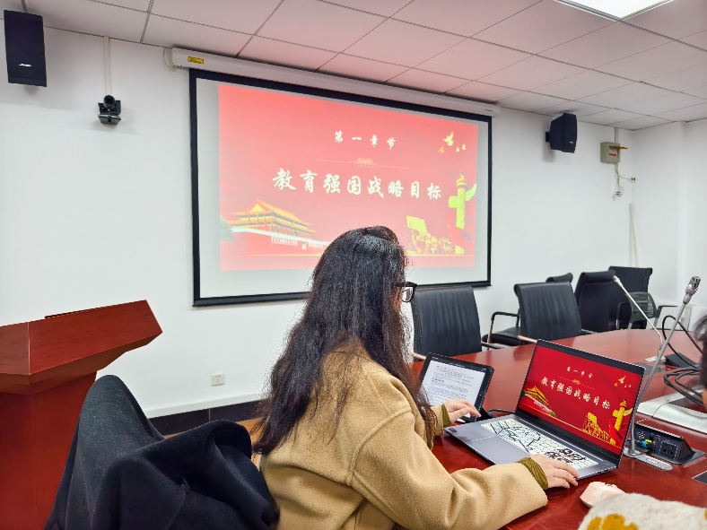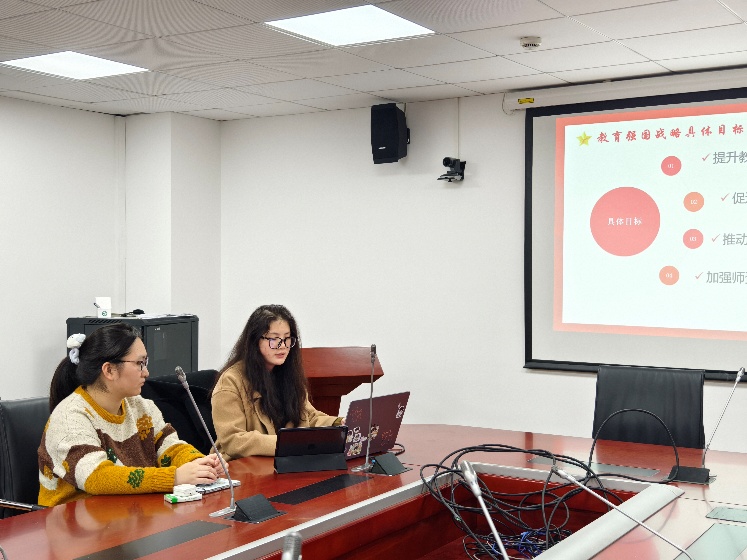 活动伊始,曹甜利同学深刻阐述了教育对于国家发展和民族复兴的基石作用,明确了建成教育强国的战略目标。然后,她深入讨论了立德树人的根本任务,让大家认识到这是深化课程改革、提升国家竞争力的关键。接着,她介绍了科教兴国、人才强国和创新驱动发展三大战略的有机结合,强调了提升教育质量、促进教育公平、推动教育创新和加强团队建设的重要性。此外,她还指出坚持思想铸魂育人的必要性,要强化师德师风建设、推进思政课程建设和优化家庭教育,共同促进家校社会协同育人。