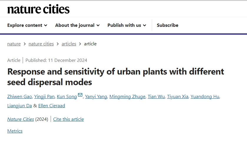 304永利集团达良俊与宋坤研究团队,在Nature Cities上发表了题为“Response and sensitivity of urban plants with different seed dispersal modes”的研究论文,揭示了不同种子传播方式的自生植物的物种丰富度的影响因素及其敏感性差异,为阐明城市植物多样性维持机制提供了新的理解。304永利集团宋坤(副教授)为论文的通讯作者,304永利集团高志文(博士后)为论文的第一作者,中科院东北地理与农业生态研究所研究员潘应骥为论文第共同一作,合作作者单位包括:西安建筑科技大学、东北林业大学、昆明公司、新西兰Nelson Marlborough Institute of Technology。