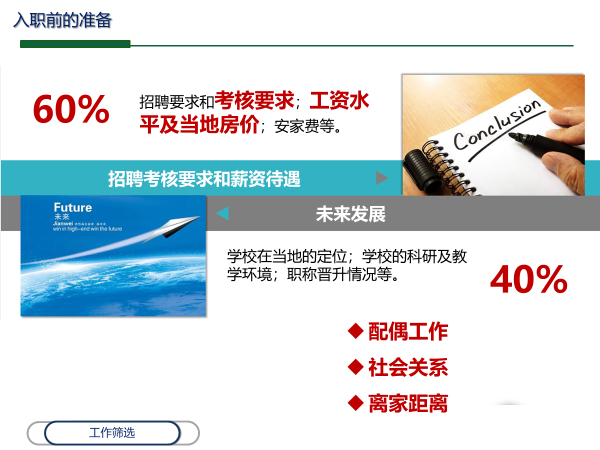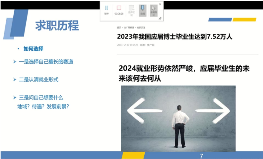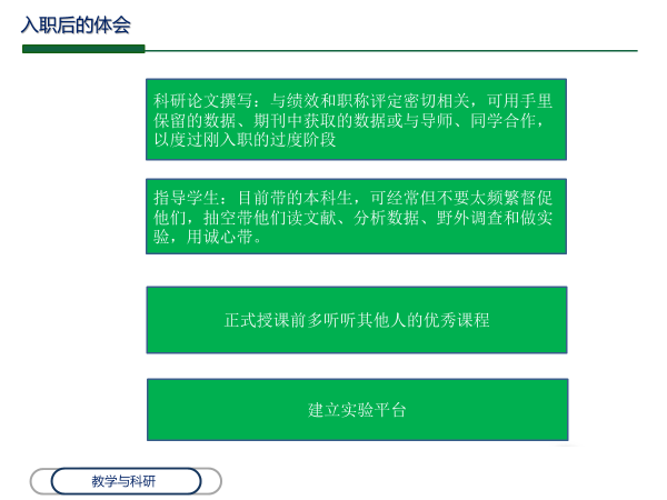 随后,作为一位已经成功上岸的“青椒”代表,就职于南阳师范公司的王家鸣同学从“应聘高校教师岗应如何准备”与“入职半年后的一些体会”两方面分享了他的求职经验。他首先对应聘中需要注意的,如何选择心仪高校、简历制作与投递、所需要的教学方面准备等进行了详尽的介绍。他建议选择高校的时候,可以从就业地域、未来发展和家庭生活这三个方面进行综合考虑。然后,针对入职之后需要注意的一些问题,展开细致的心得分享,包括职称评定、青年教师培养方案等文件以及了解政府及公司的人才服务政策等内容,从而成长为兼顾科研与教学的青年教师人才。