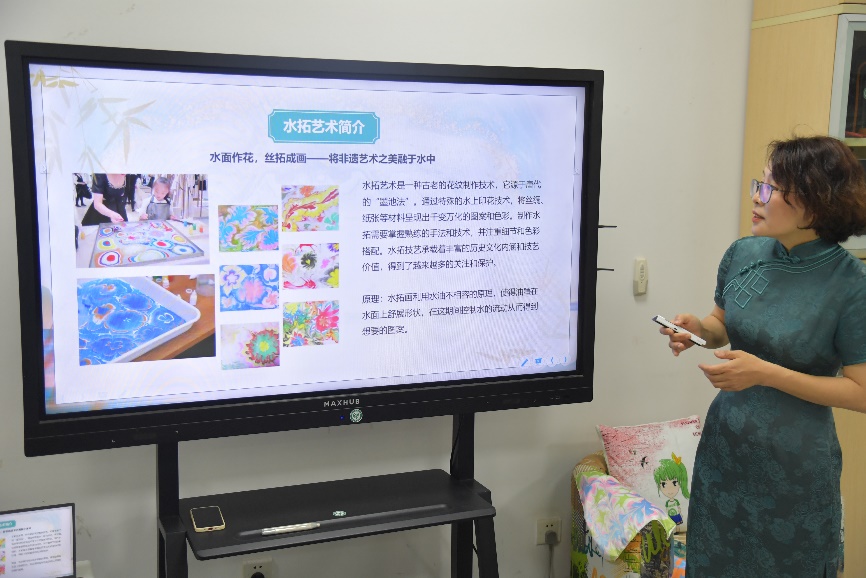 活动伊始,路葵老师用PPT向老师们介绍了水拓的历史背景、制作工艺以及其中所蕴含的文化内涵。水拓艺术作为中国古代扎染技艺的一种,具有悠久的历史和独特的艺术魅力。它源于唐代的“墨池法”,通过特殊的水上印花技术,将丝绸、纸张等材料呈现出千变万化的图案和色彩。制作水拓需要掌握熟练的手法和技术,并注重细节和色彩搭配。学习了水拓技艺背景知识,老师们对水拓有了更加深入的了解,也对即将开始的创作环节充满期待。