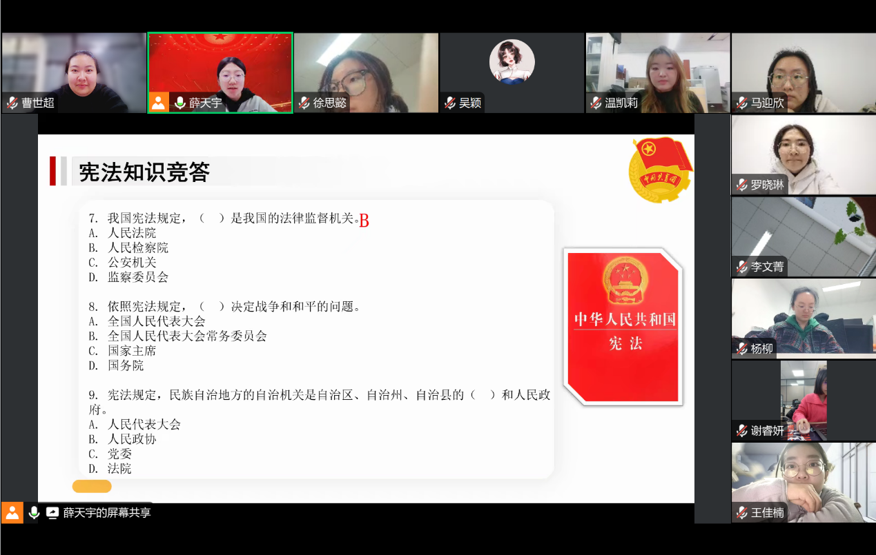 随后进行了宪法知识竞答环节。竞答题目涵盖了宪法的多个方面,涉及国家权力归属界定、宪法修改程序规范、国家机构体系架构、公民权利义务范畴、根本政治制度要义等多个要点。同学们积极踊跃参与,竞相举手答题,思维碰撞间彰显2024级生态学系硕士研究生团支部扎实的宪法知识功底。