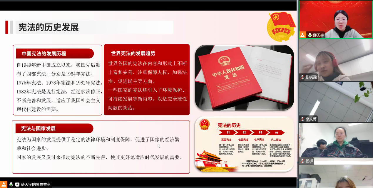 活动伊始,团支部书记薛天宇对宪法定义、至高地位及关键作用展开系统阐释。点明宪法作为根本法,是其他法律法规赖以产生、存在、发展和变更的基础,具有至高无上的法律效力。继而深入梳理了中国宪法的发展历程,自1949年新中国成立后四部宪法相继颁布,到现行的1982年宪法及其多次修正,清晰呈现宪法伴随国家现代化建设进程持续调适完善的轨迹。同时,介绍了世界宪法的发展趋势,强调了宪法在保障人权、深化法治、促进民主及应对全球性问题等方面的重要性。从国家机构组织架构到公民权利义务配置,宪法条款全方位维系社会和谐稳定、保障个体福祉,成为政治生活的最高准则及公平正义的坚实后盾。