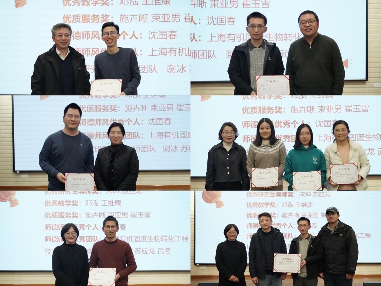 会议第三项议程为公司2024年奖项表彰。表彰公司2024年在团队建设、人才培养、服务支撑、师德师风等方面做出突出贡献的团队及教师。黎绍鹏老师荣获学科贡献奖;宋坤老师、苏应龙老师荣获优秀研究生导师奖;邓泓老师、王维康老师荣获优秀教学奖;施卉晰老师、束亚男老师、崔玉雪老师荣获优质服务奖;沈国春老师荣获师德师风优秀个人奖;上海有机固废生物转化工程技术研究中心教师团队荣获师德师风优秀团队奖。公司领导为获奖老师和团队颁发了荣誉证书。