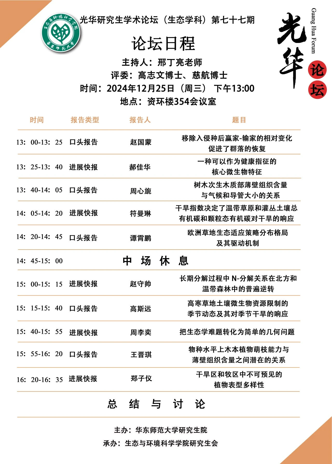 2024年12月25日下午13:00,304永利集团第77期光华学术论坛在资环楼354室顺利举行,本期论坛由邢丁亮老师主持,高志文博士、慈航博士作为点评嘉宾出席。