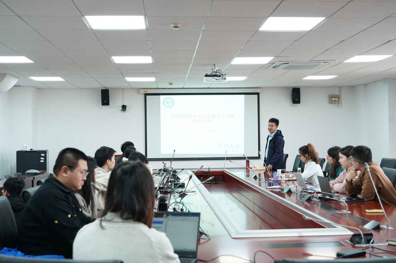 上半场第一位汇报人是来自黎绍鹏老师课题组的赵国蒙同学,他口头汇报的题目是《移除入侵种后赢家-输家的相对变化促进了群落的恢复》。研究结果为:移除入侵种后,本地群落的多样性格局没有显著改变,赢家的盖度变化量较于输家分布的更加均匀且与入侵种亲缘关系更远的物种更有可能成为赢家。第二位汇报人是来自黎绍鹏老师课题组郝佳华同学,他进展汇报的题目是《一种可以作为健康指征的核心微生物特征》。研究结果为该研究揭示了具有广泛的适用性的两个相互竞争动态肠道核心微生物基因组;这种稳定相关的肠道基因组可以作为疾病分类和预测治疗效果的生物标志物;二分功能群体现了肠道微生物内在微妙平衡和广泛健康影响。第三位汇报人是来自宋坤老师课题组的周心旎同学,她口头汇报的题目是《树木次生木质部薄壁组织含量与气候和导管大小的关系》。该研究下一步的分析方向为:区分具有环管管胞的物种,探究环管管胞的存在与气候、导管大小的关系是否存在差异。对RP、AP的排列方式进行分类,探究不同类型的薄壁组织与气候、导管大小的关系。第四位汇报人是来自周小奇老师课题组的符曼琳同学,她进展快报的题目是《干旱指数决定了温带草地和灌丛土壤中总有机碳和颗粒态有机碳对极端干旱的响应》。研究目的是通过一项多站点的模拟干旱实验探讨干旱如何影响温带草原和灌丛生态系统中的SOC、POC和MAOC,并评估不同干旱梯度土壤碳对干旱处理的响应存在何种差异。第五位汇报人是来自郭文永老师课题组的谭霄鹏同学,他口头汇报的题目《欧洲草地生态适应策略分布格局及其驱动机制》。研究结果表明,SOC对干旱的响应取决于其当地的长期干旱程度,环境因子的干旱敏感性在不同干旱程度的地区之间存在差异,进而导致了土壤碳响应的不同;与MAOC相比,POC的干旱敏感性更高,可能是因为POC由周转时间较短的物质组成且容易被微生物利用,而MAOC与矿物表面结合并具有生化抗性。