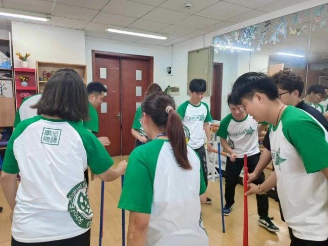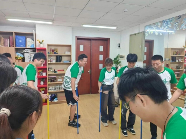 棍子接力游戏中员工们围成一个大圈,每人手中都握着一根棍子,当顺时针移动时,必须将自己手中的棍子传递给下一个同学,但绝不能让棍子掉下来。一旦有人掉棍,就会被淘汰出局。这个游戏为活动现场增添了活力和紧张感,同学们的默契程度逐渐上升。
