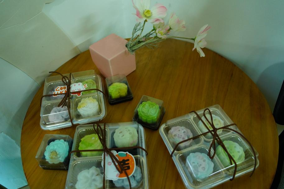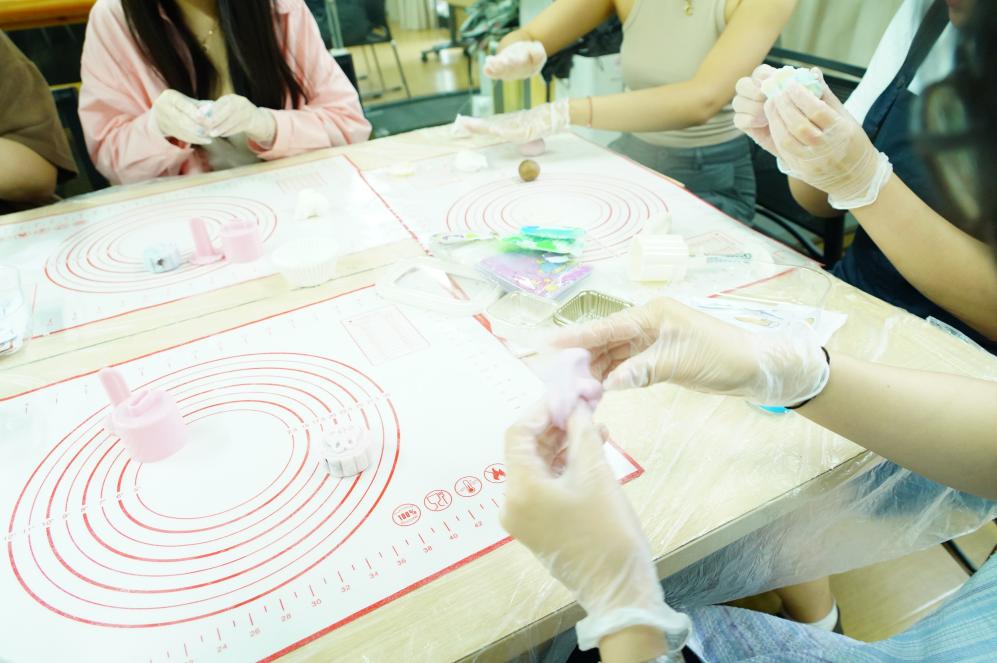 活动伊始,董柳彤同学为大家讲解了冰皮月饼的步骤、示范了月饼的制作流程并说明了相关注意事项。在此次活动中,研会生涯部为大家准备了各种的馅料,包括红豆馅料、绿豆馅料、紫薯馅料、芋泥馅料等不同口味,饼皮也分别用不同的果味粉调色,同学们可以根据自己的喜好选择不同颜色的饼皮,好看的同时也让人食欲大开。同学们兴致盎然、跃跃欲试,互相协作,一起动手制作冰皮月饼,揉饼皮、包馅料、裹上熟食粉、最后挑选自己喜欢的模具,将揉好的月饼放进去轻轻一压,一个个精美的月饼便制作完成了!制作的过程中,大家互相帮助,共同学习,分享各自制作月饼的技巧,相互展示自己满意的作品,通过本次活动,不仅增强了同学之间互帮互助的意识,并且也在无形之间拉近了彼此之间的感情。