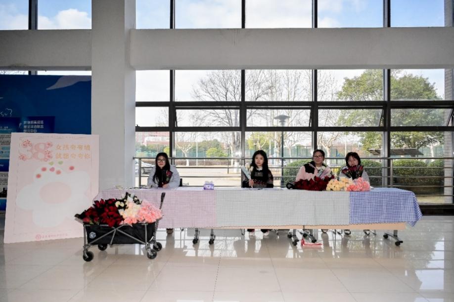 活动现场,寓意着美好祝福的鲜花已整齐摆放,粉白相间的"女孩夸夸墙"立于大厅中央,成为当天最亮眼的打卡点。