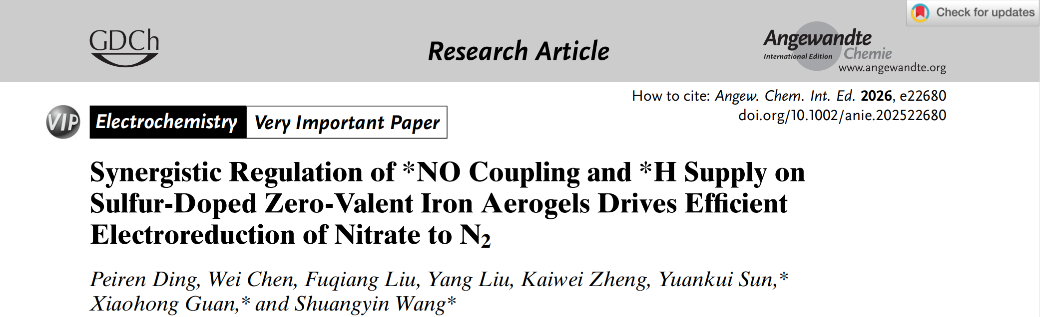 该研究工作日前以“Synergistic Regulation of*NO Coupling and*H Supply on Sulfur-Doped Zero-Valent Iron Aerogels Drives Efficient Electroreduction of Nitrate to N2”为题发表于国际知名期刊《Angewandte Chemie International Edition》(IF = 17)上,并被选为Very Important Paper。公司关小红教授、孙远奎教授及湖南大学王双印教授为文章共同通讯作者,公司博士生丁沛仁为文章第一作者,304永利集团为论文第一完成单位。该研究受到国家自然科学基金(22276057和22025601)的资助。