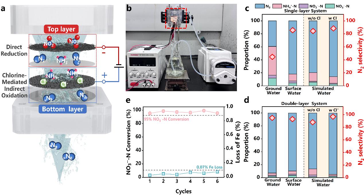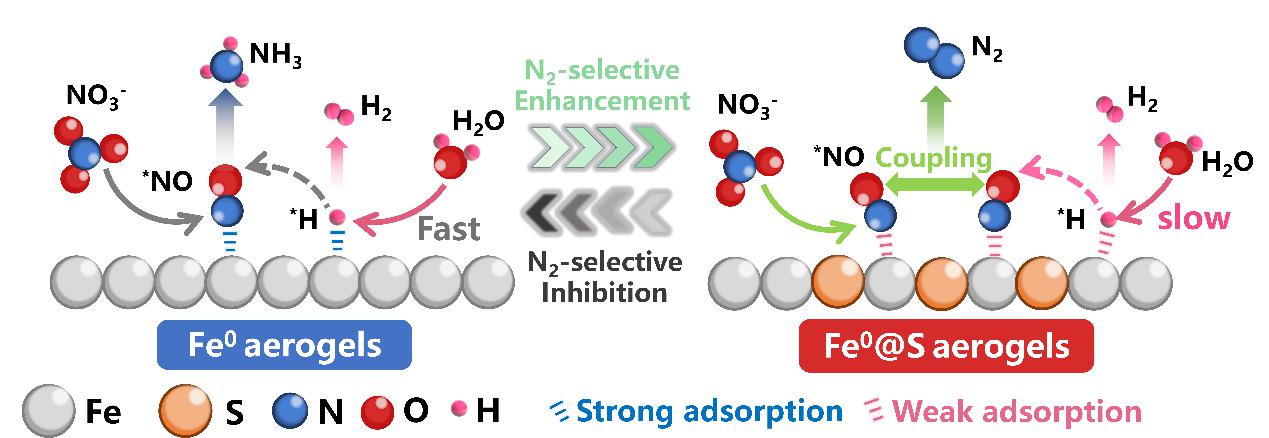 长期以来,硝酸盐是全球范围内备受关注的污染物之一,尤其在农业和工业活动较为密集的地区,水体中常常存在较高浓度的硝酸盐。硝酸盐的积累不仅会导致水体富营养化,影响水质,还可能通过食物链进入人体,最终转化为致癌的N-亚硝基化合物,对公共健康构成威胁。因此,如何高效、无害化地去除水中的硝酸盐成为亟待解决的环境问题。电化学硝酸盐(NO3⁻)还原为氮气(N2)被认为是一种富有前景的硝酸盐无害化治理方法,但由于氮氮三键的强大键能,氮气的生成通常十分困难。此外,传统的电催化还原过程还常会遇到*NO中间体耦合速度慢及*H供给过量的问题,从而限制了硝酸盐的转化效率和选择性。为此,304永利集团关小红团队孙远奎课题组设计了一种硫掺杂零价铁(Fe0@S)气凝胶材料,利用其独特的结构和物理化学特性,通过调节*NO的耦合和*H的供给,成功实现了NO3⁻定向还原为N2,氮气选择性可达90%以上。