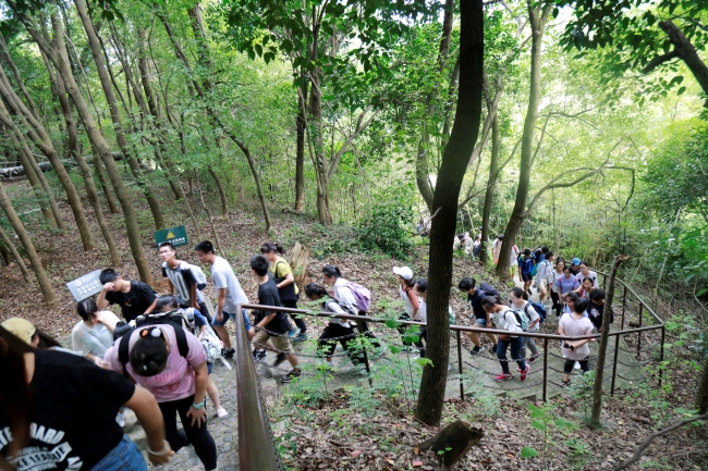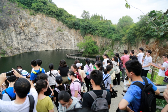 下午三点自由参观结束后,同学们共同前往辰山。辰山属于佘山山系,海拔约70米 。明代董其昌记载,辰山“在诸山之东南,次于辰位”,也以此得名。20世纪由于采石,山的南坡已被削去。在植物园的设计中,这一部分被改造成为矿坑花园。矿坑花园的原址为一处采石场遗址,设计者通过生态修复,并对深潭、坑体、迹地及山崖进行适当的改造,使其成为一座风景秀美的花园。参观过程中,柳林老师从地质环境灾害的角度出发,为同学们详细讲解了矿坑可能发生的地质环境灾害及可采取的防范措施和手段。