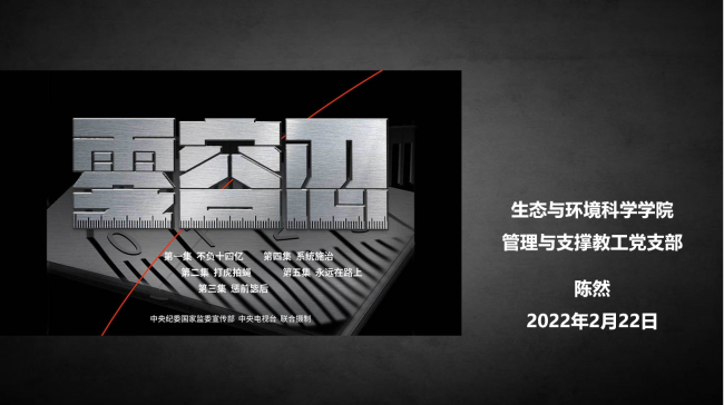 陈然老师分享了由中央纪委国家监委宣传部与中央广播电视总台联合摄制的电视专题片《零容忍》,该片展现的是以习近平同志为核心的党中央坚持全面从严治党、一刻不停推进党风廉政建设和反腐败斗争的故事。共分《不负十四亿》、《打虎拍蝇》、《惩前毖后》、《系统施治》、《永远在路上》五集,选取16个案例,采访了纪检监察干部、有关审查调查对象及涉案人员、干部群众140多人,通过一个个发人深省的故事,展现了党中央“老虎”“苍蝇”一起打的决心,讲述了纪检监察机关在纪检监察工作中惩前毖后、治病救人的理念,介绍了查处案件中总结共性问题,剖析深层原因,查找体制机制和监督管理漏洞,系统施治的过程。陈老师结合案例分享了自身的感悟,一个政党需要不断地自我革命,而作为普通党员,作为个人则要不断地自我警醒、自我反思,扣好廉洁第一粒扣,不断锤炼理想信念,真正做到“不忘初心”。
