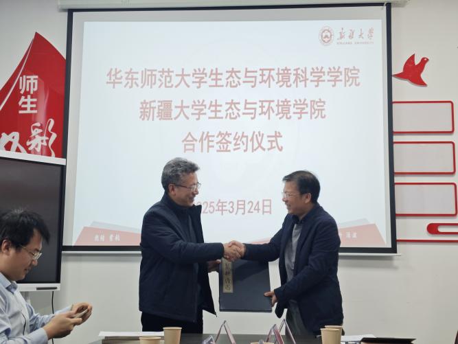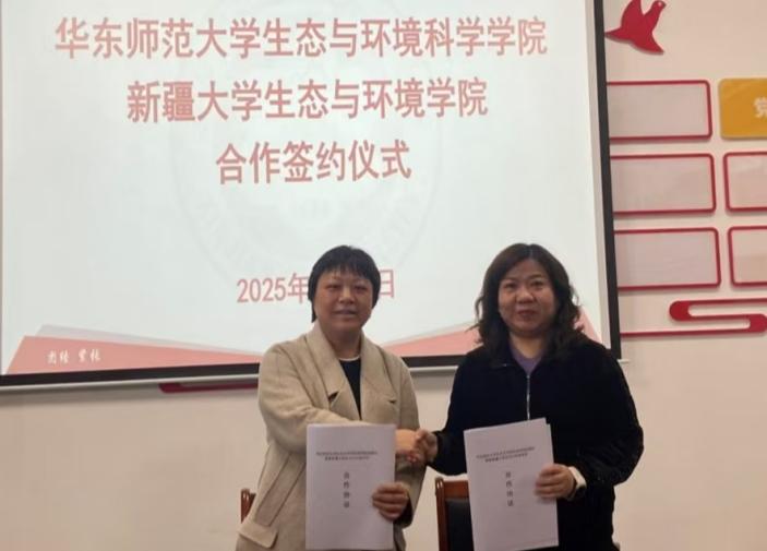 华东师大公司党委书记嵇渭萍、新疆老员工态与环境公司党委书记贡璐代表双方签订合作协议。