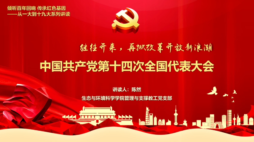 第十二讲“继往开来,再掀改革开放新浪潮——中共十四大历史回顾”由管理与支撑教工党支部党员陈然讲读。陈然老师带领大家通过梳理自1978年十一届三中全会实施改革开放以来14年的进程,回顾了十四大召开的国内外形式和历史背景。1992年十四大召开前夕,邓小平南巡谈话,回答了什么是社会主义,怎么建设社会主义的问题,指明了社会主义的本质,解放了人们的思想;同年十四大的召开,以南方谈话精神作为贯穿全篇的主线,进一步明确了我国经济体制改革的目标,即建立社会主义市场经济体制,标志着我国经济改革进入了快车道。十四大是承先启后、继往开来的大会,在邓小平南方谈话和十四大精神的鼓舞下,全党和全国各族人民建设中国特色社会主义的热情高涨,掀起了又一轮改革发展的大潮,使我国改革开放和现代化建设呈现出崭新面貌。