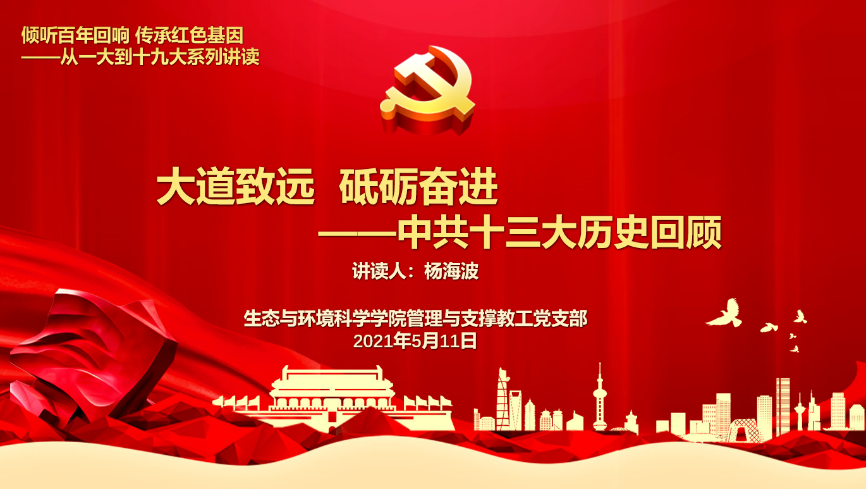 第十一讲“大道致远,砥砺奋进——中共十三大历史回顾”由管理与支撑教工党支部党员杨海波讲读。杨海波老师为大家详细介绍了中共十三大的召开背景、会议内容及其重要意义。十三大阐明了关于社会主义初级阶段的理论,明确概括了党在社会主义初级阶段的基本路线,确定了经济建设发展“三步走”的战略部署,开辟了具有中国特色的社会主义建设之路。其中,正式制定社会主义初级阶段基本路线,是十三大载入史册的最重要贡献。