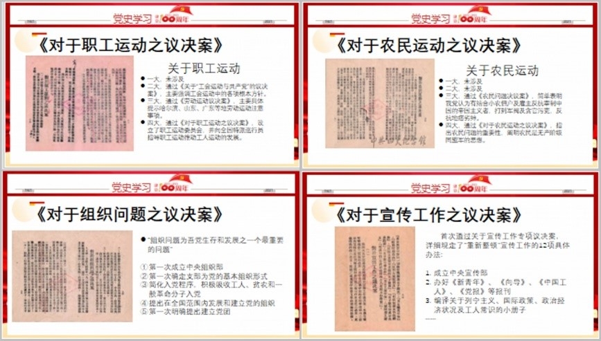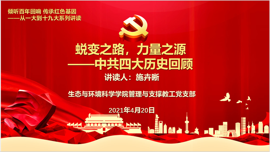 第四讲由管理与支撑教工党支部党员施卉晰讲读“蜕变之路,力量之源——中共四大历史回顾”。施老师带领大家从时间、地点、人物以及事件四个方面着手,一起回顾了四大召开时间为什么会在1925年,会议地点的来龙去脉,特别介绍了李大钊和毛泽东两位同志没能参加四大的原因,并简单介绍了出席四大的代表周恩来和汪寿华的情况。中共四大产生了14个会议文件,其中11个是议决案。施卉晰跟大家分享了其中4个议决案——《对于职工运动之议决案》、《对于农民运动之议决案》、《对于组织问题之议决案》和《对于宣传工作之议决案》。中国共产党第四次全国代表大会,第一次提出了无产阶级领导权问题,第一次提出了工农联盟问题,统一了全党的思想认识,使党站在国民革命之领袖地位,推动了工人、农民运动的大发展,掀起了全国反帝运动,迎来了大革命的高潮。从马克思主义中汲取强大的力量,中国共产党的建设和发展从此开始蜕变。