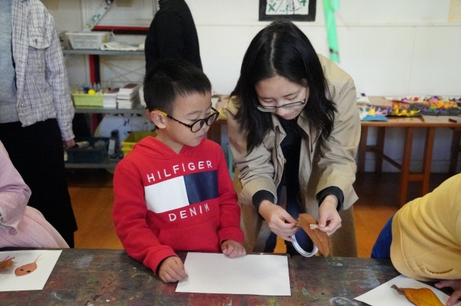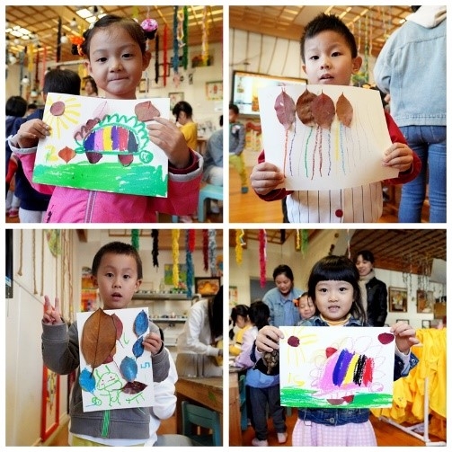 最后,所有同学共同参与了“大自然的脸”落叶拼贴画活动,彭思同学对拼贴画活动进行了讲解,活动旨在激发小朋友的想象力,利用秋天各色的落叶进行拼贴画制作,同时引导小朋友形成“落叶很美”的欣赏眼光,让他们能去观察身边的自然环境中处处存在的美好。活动过程中每位同学负责3-5位小朋友,耐心细致地进行指导,充分鼓励小朋友展开自己的联想,并且通过实践活动把所思所想创造在纸面上。