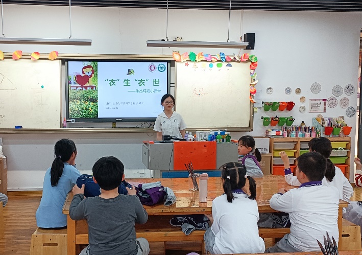 课程接近尾声时,讲师们带领同学齐声朗读《环保倡议歌》:“小手巧整理,衣柜换新颜;旧衣别丢弃,回收献爱心……”清脆的童声回荡在教室里,仿佛播撒下一颗颗绿色的种子。