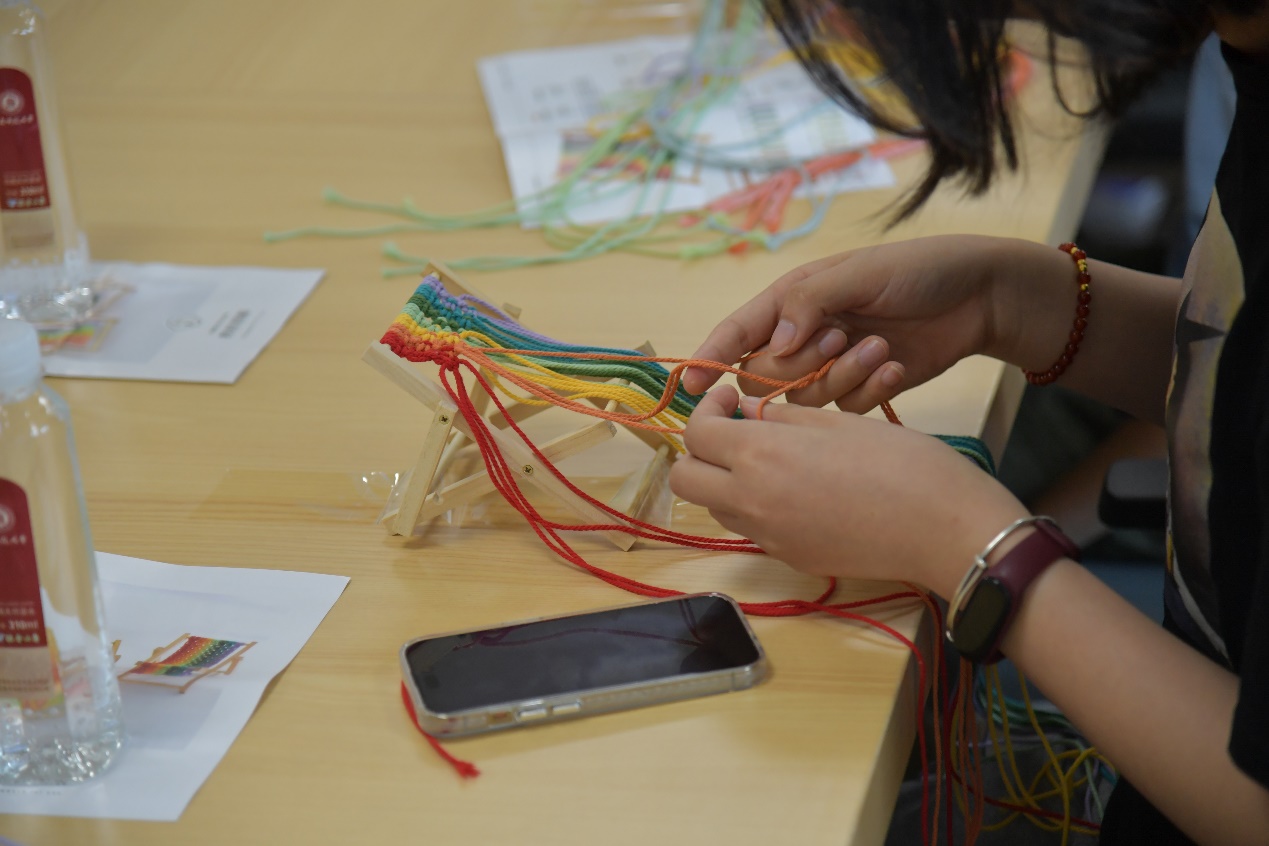 活动现场,七色编织材料整齐摆放,大家通过讲解和视频演示很快掌握了编绳的操作要领。随着一根根彩绳在指尖翻飞,一道绚丽的“彩虹”在手中诞生,小小沙滩椅逐渐成型。大家展示着自己的作品,成就感与自豪感溢于言表。制作过程中,大家相互学习和帮助,同时一起聊聊奥运精彩赛事,共度了两个多小时的快乐时光。