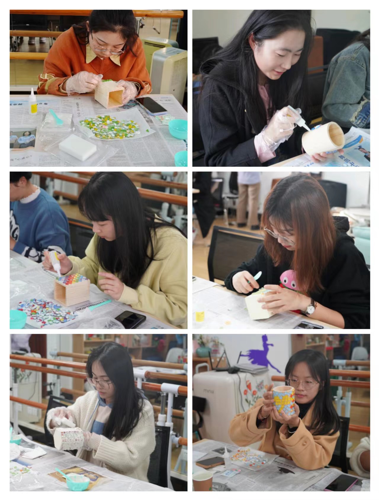 同学们在认真制作马赛克笔筒