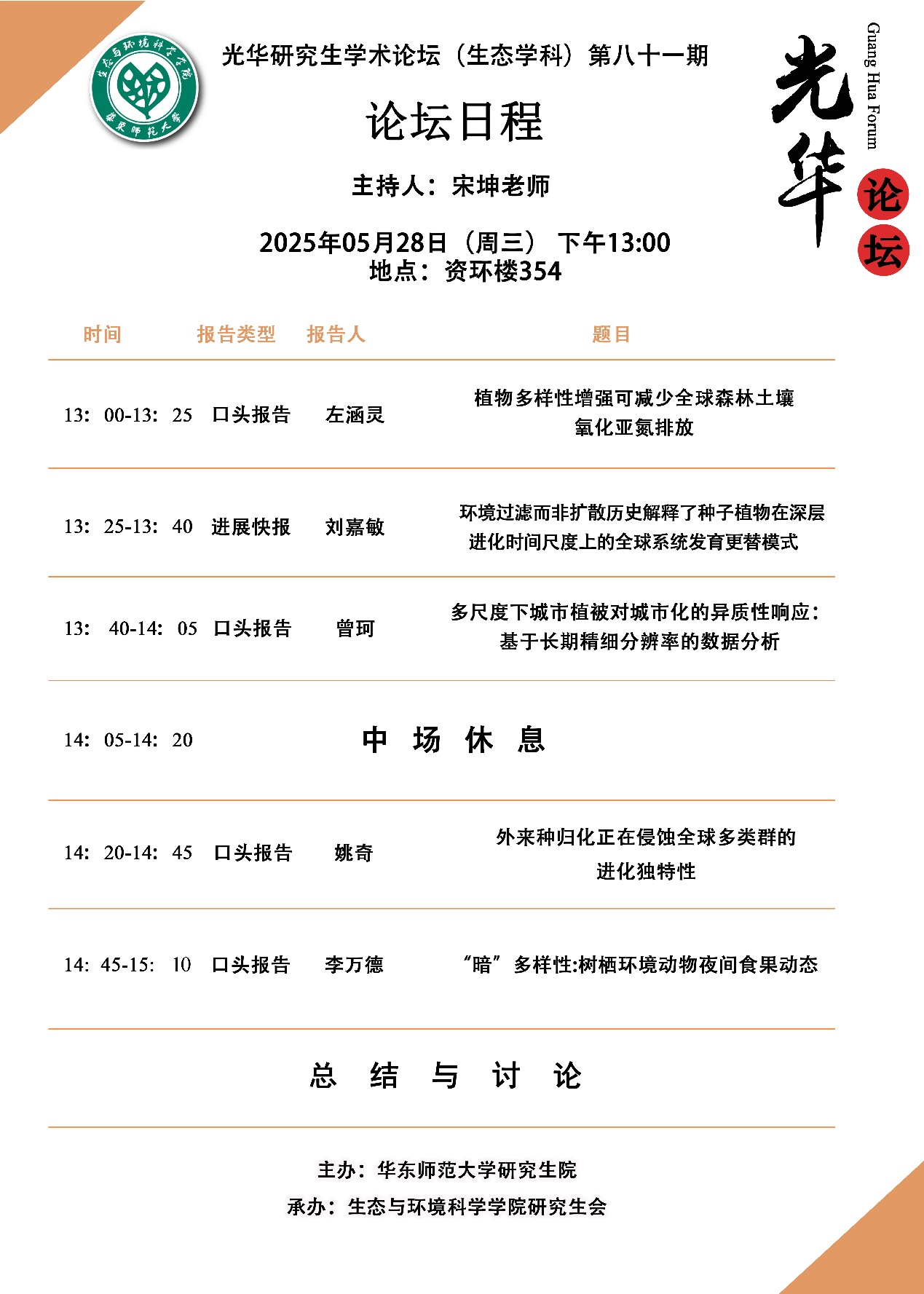 上半场的第一位汇报人是来自周小奇老师课题组的左涵灵同学,她口头报告的题目是《植物多样性增强可减少全球森林土壤氧化亚氮排放》,研究结果强调了在森林中保持较高树木多样性对于减缓全球气候变化影响的重要性,为森林管理、植树造林以及减缓气候变化提供理论依据和数据支撑。第二位汇报人是来自黎绍鹏老师课题组的刘嘉敏同学,她进展快报的题目是《环境过滤而非扩散历史解释了种子植物在深层进化时间尺度上的全球系统发育更替模式》,该研究揭示了全球种子植物系统发育和分类差异是由过去和现在的分散历史以及环境过滤过程共同作用的结果。第三位汇报人是来自刘敏老师课题组的曾珂同学,她口头报告的题目是《多尺度下城市植被对城市化的异质性响应:基于长期精细分辨率的数据分析》,她的研究为精细化城市生态系统管理和气候适应性规划提供了科学依据。