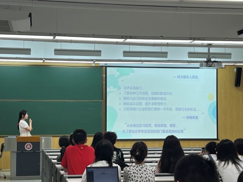 第三位分享嘉宾周心旎通过“百县笃行”与合肥市“扬帆计划”于合肥市生态环境局土壤生态环境处进行实习。他首先强调了自己实习的目的在于去体验、感受,去了解生态学专业在政府部门里最直接的应用。周心旎同学以合肥市生态环境局为例,介绍了生态环境局的内设机构和具体职责。此外,她还分享了自己在实习期间参加各类会议、参与各项检查以及撰写各类文件的心得和经验,这些经历让她体会到实际工作和校园生活的不同,更提高了问题分析与解决能力。