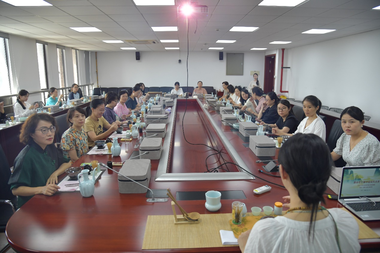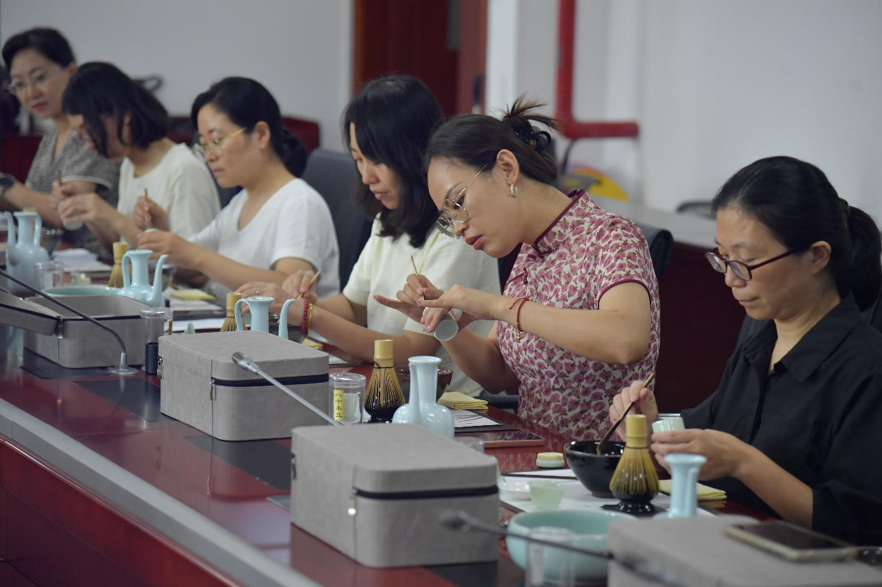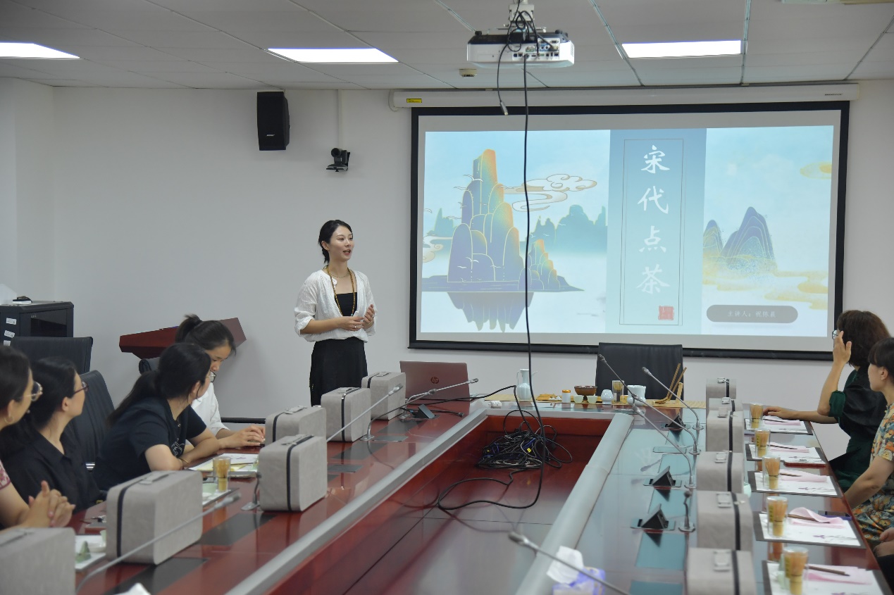 作为中国传统文化的瑰宝,宋代点茶不仅展现了古人对茶的独特理解与热爱,更蕴含了深厚的文化底蕴和审美追求。体验活动现场布置古色古香,营造出浓厚的宋代文化氛围。茶艺老师从点茶脉络发展、点茶器具、点茶流程及点茶衍生文化等五个方面,详细为老师们讲解了宋代点茶的历史渊源、制作流程及文化意义,让大家在轻松愉快的氛围中领略到了点茶文化的博大精深。