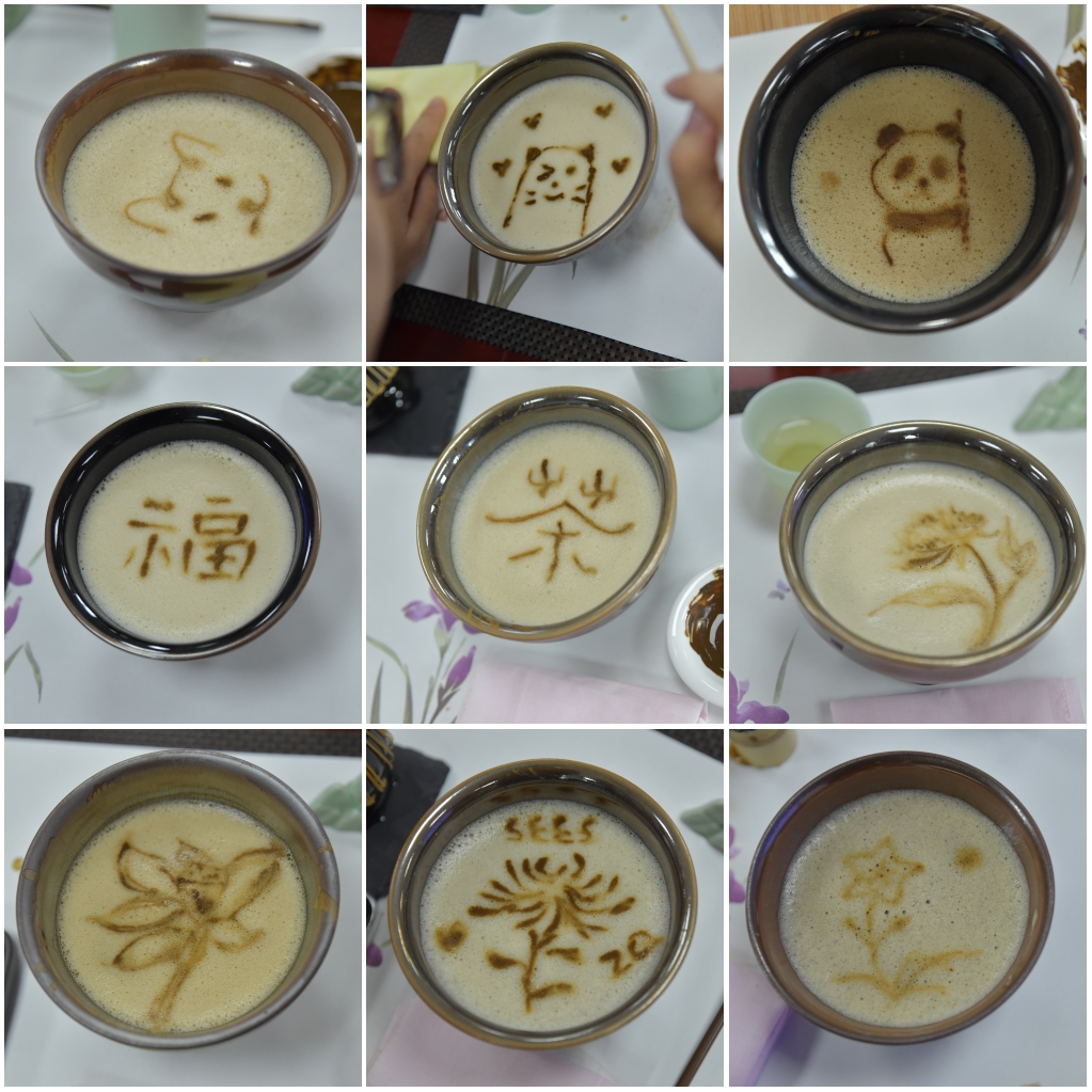 从茶粉注入少量沸水,用茶筅轻轻搅拌直至流动的糊状,再次注入沸水至茶筅高度的一半,同时用茶筅快速用力击拂,使茶汤表面出现细腻泡沫,第三次注入沸水,茶筅要轻盈均匀,拂去大的泡沫,此时茶面沫饽已经成型。执壶注水,将茶末调成茶膏,这一步是点茶作茶膏画的基础。最后,各位师生们根据选择自己喜欢的图案或者文字,在沫饽上进行茶膏画的创意绘制,有古风意境的绿竹,有雅致韵味的清荷,有可爱敦厚的熊猫.......风格各不相同,各有千秋。点茶过程的每一步都充满了仪式感与趣味性,大家一边操作,一边交流心得,不时传来阵阵欢声笑语。